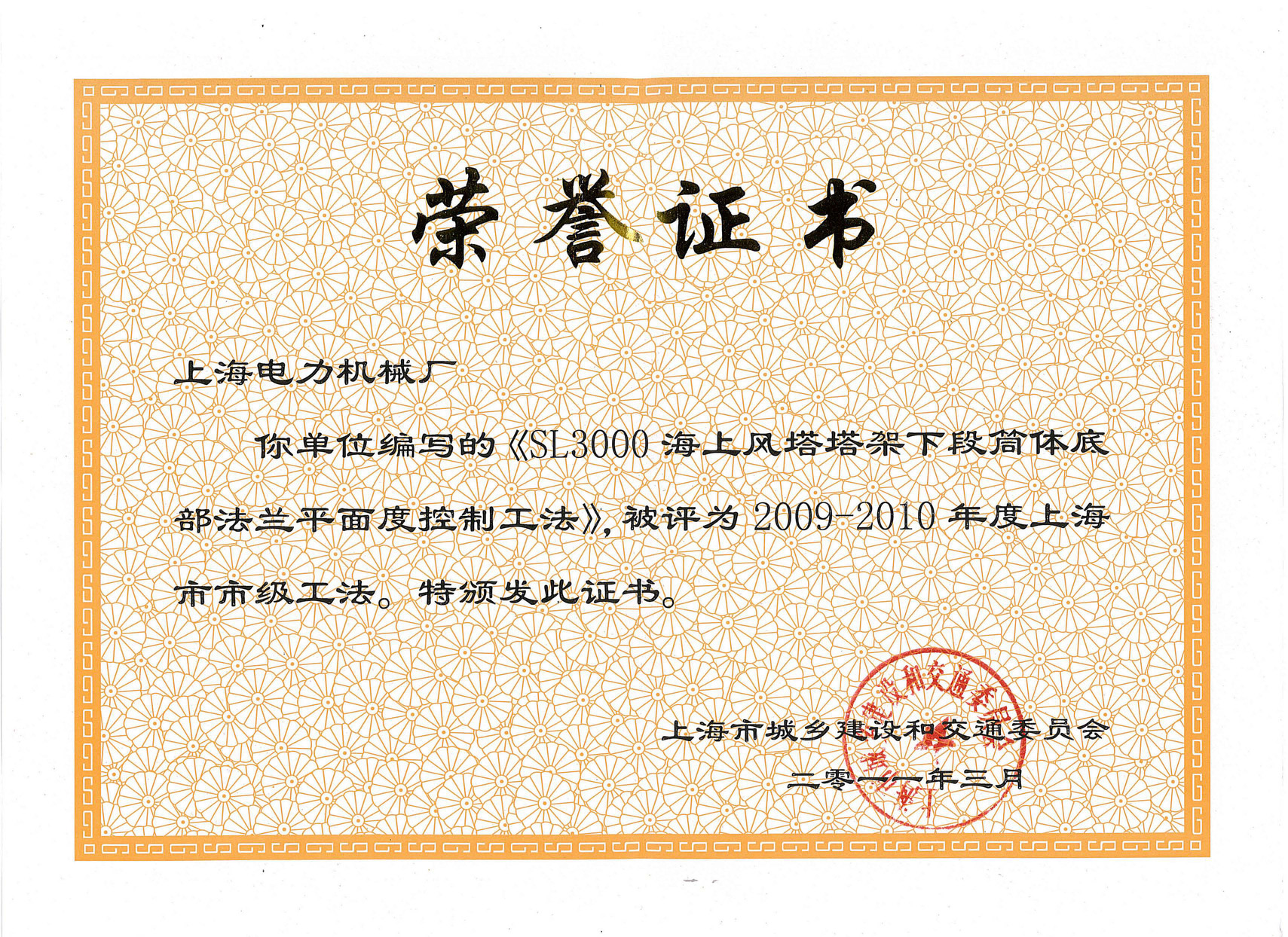 2009-2010年度上海市市级工法【SL3000海上风塔塔架下段筒体底部法兰平面度控制工法】