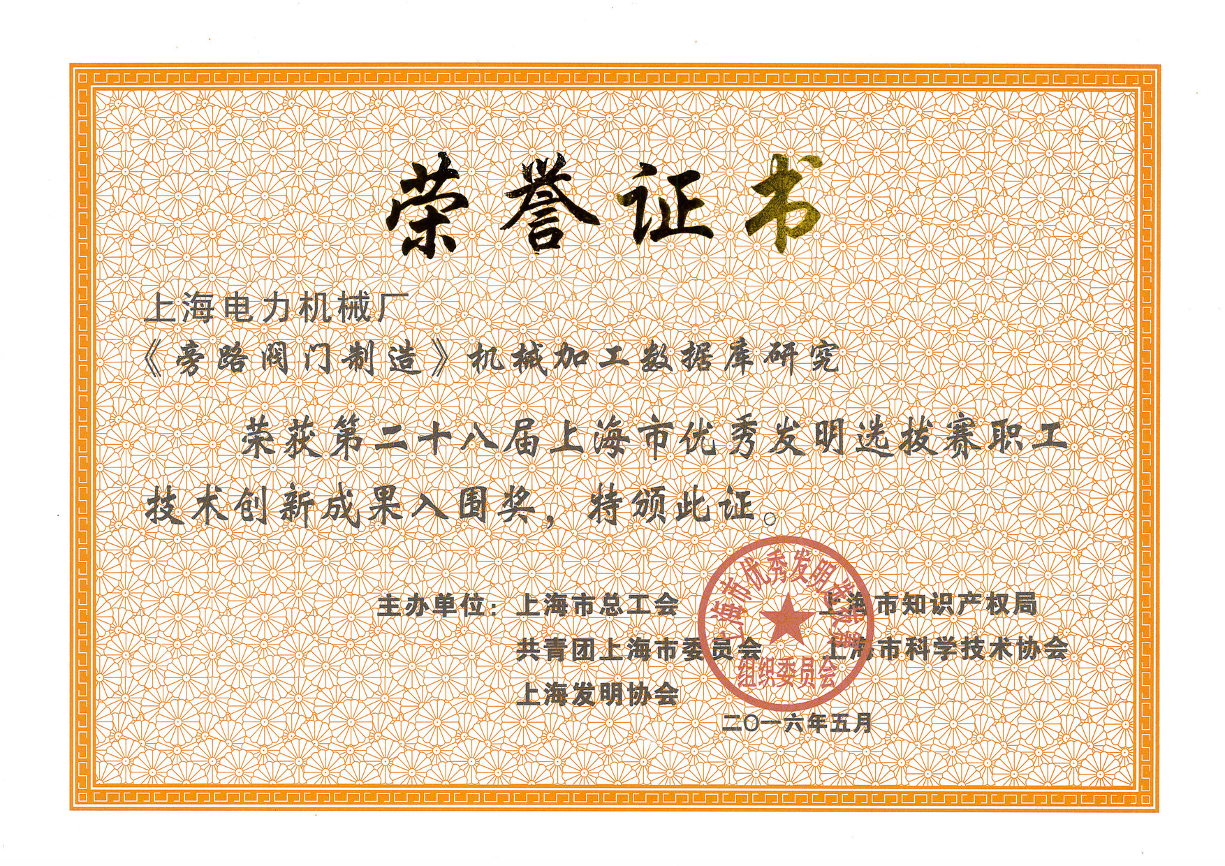 2016年上海市优秀发明选拔赛职工技术创新成果入围奖【《旁路阀门制造》机械加工数据库研究】
